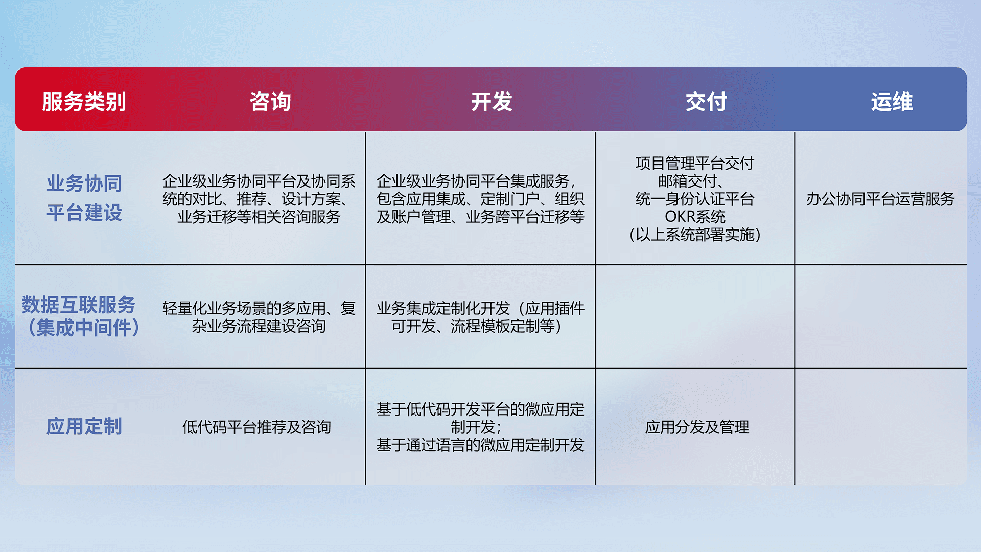 针对钉钉、、企微、、、、IDaas等平台级产品提供产品的规划、、、方案、、交付、、、定制化开发等服务,,实现如统一协同办公、、、智能客户服务、、混合会议管理、、、智能数据查询、、、等业务场景,,实现数字化转型。。